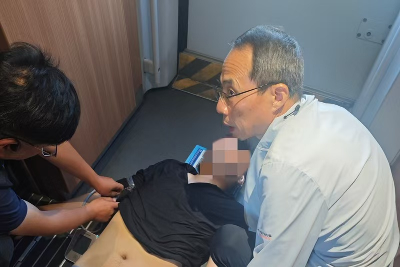 赶到现场时,只见一名青年男子仰面倒在过道上,脸色惨白,已经失去了意识。列车员急忙上前,向赶来的几位医务人员说明情况。时间就是生命,黄一虹与刘洋、董国凯迅速进入急救状态。有丰富临床经验的黄一虹,在快速检查后,凭借专业的判断,确定该男子是由于高温导致脱水昏迷。他当即制定了救援方案,用列车上的冷冻矿泉水,为患者进行物理降温。与此同时,董国凯快速查看患者的随身物品,抓紧时间联系患者家属;刘洋则立刻着手调配盐糖水,为患者补充能量。