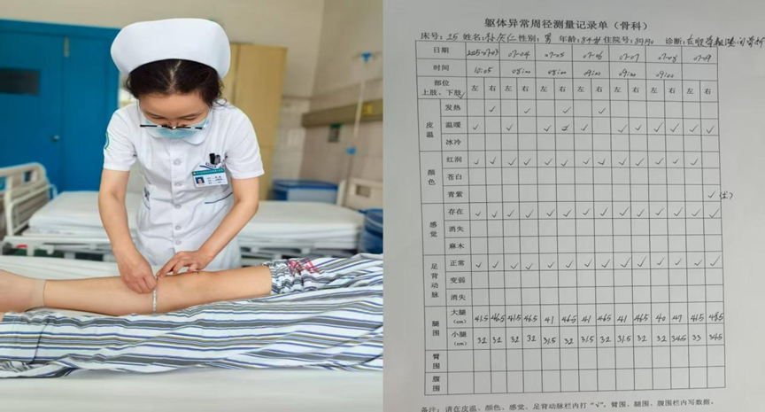 对于已出现肌间血栓的患者,护理团队启动“精细化监测模式”:每日定时测量腿围(精确到厘米),详细记录肿胀程度、皮肤温度及患者主诉,并用定制的监测表格追踪数据变化。这些看似琐碎的数字,实则是观察血栓进展的“晴雨表”——通过数据对比,医护团队能及时调整治疗方案,为临床决策提供精准依据,让干预更及时、更有效。