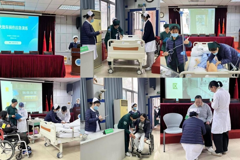 本次演练模拟主城区主干道发生重大交通事故,造成10名人员不同程度受伤,其中包括重伤1人、中伤3人、轻伤6人,伤员需紧急转运至我院救治。14时整,演练正式开始。急诊分诊台接到120急救中心转运通知后,立即启动《突发群体事件护理应急预案及处理流程》,迅速上报医务处与护理部,紧急调配医护人员、清点并准备抢救物资,合理划分红(危重)、黄(中伤)、绿(轻伤)三区救治区域,并开通急诊绿色通道,确保伤员得到及时有效救治。