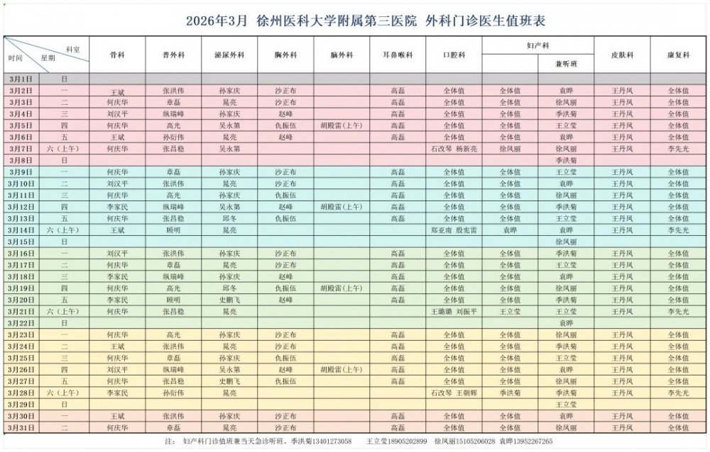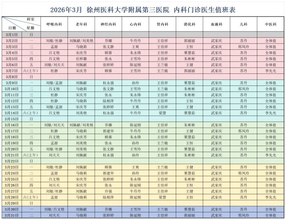 【公告】3月 徐医附三院门诊排班一览表
