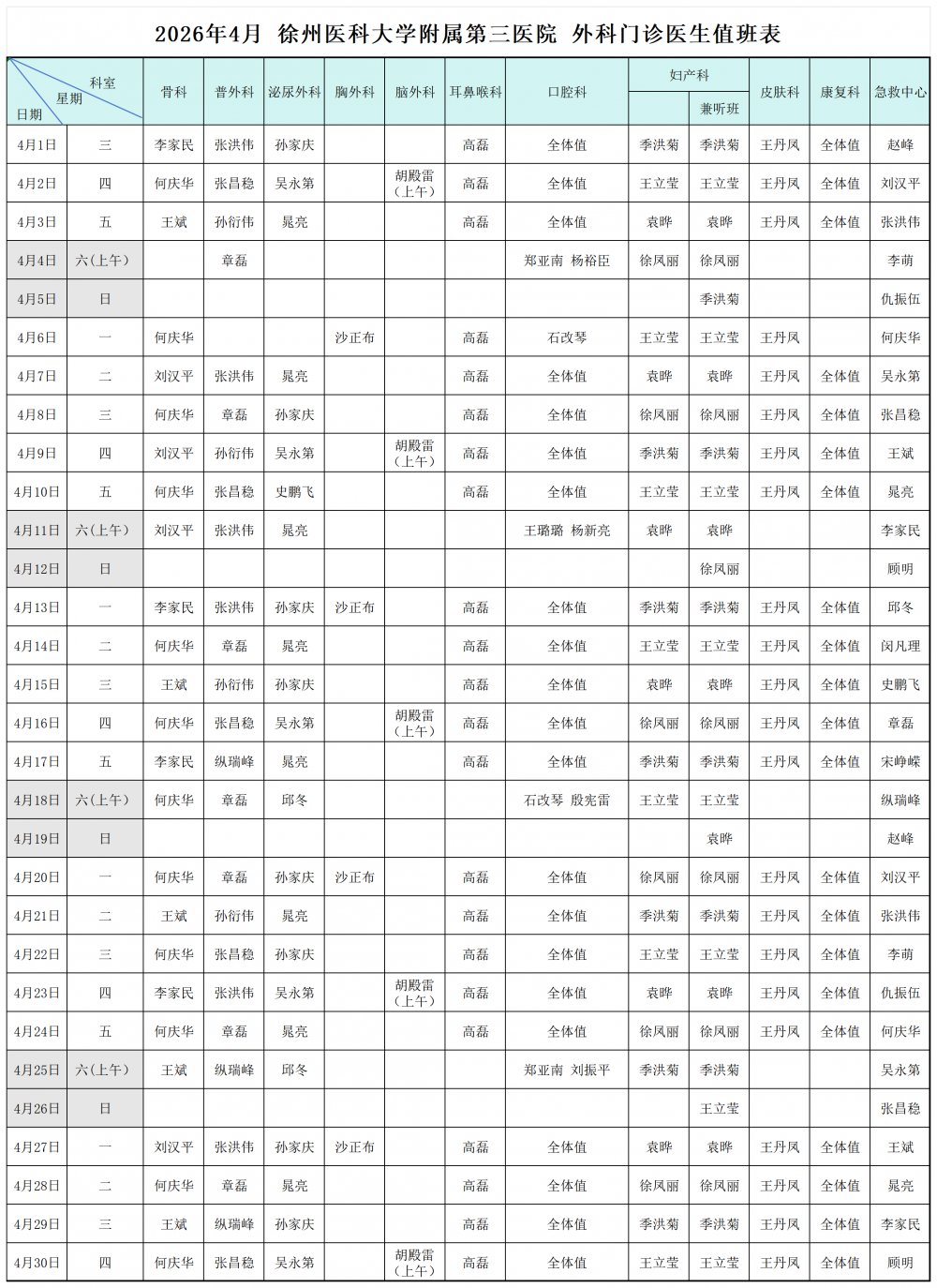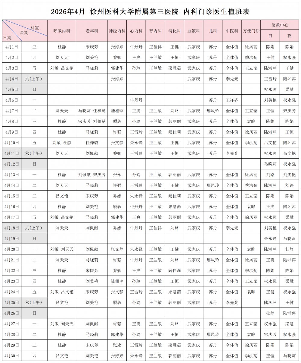 【公告】4月 我院门诊排班一览表